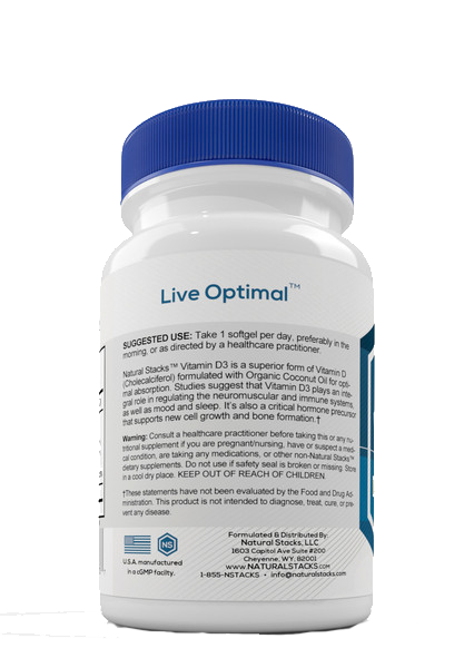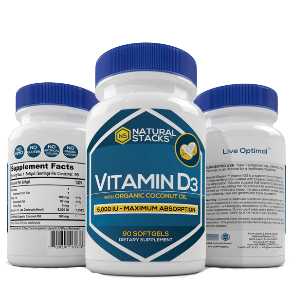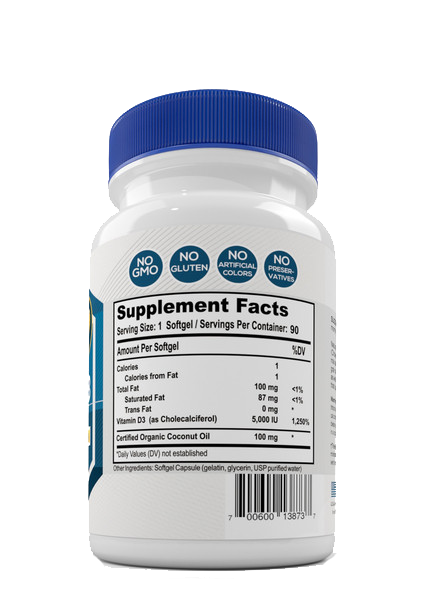- 5,000 IU of D3 with 100 mg of Certified Organic Coconut Oil per softgel